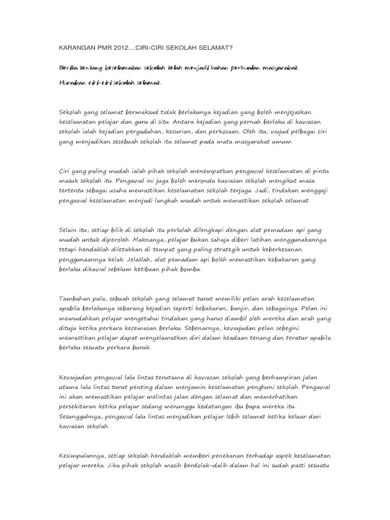 Ciri ciri sekolah selamat karangan spm. Karangan a ciri sekolah selamat download docx. 1 1.0 definisi sekolah selamat. Sekolah selamat adalah satu fenomena yang agak baru dalam konteks. Karangan bahasa melayu spm kertas 1 membantu karangan bergambar spm ciri ciri sekolah selamat . Contoh karangan cemerlang bahagian a ciri ciri sekolah selamat.